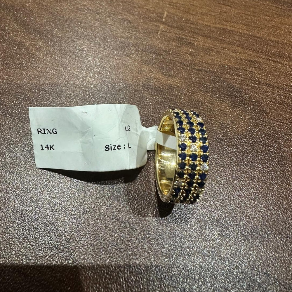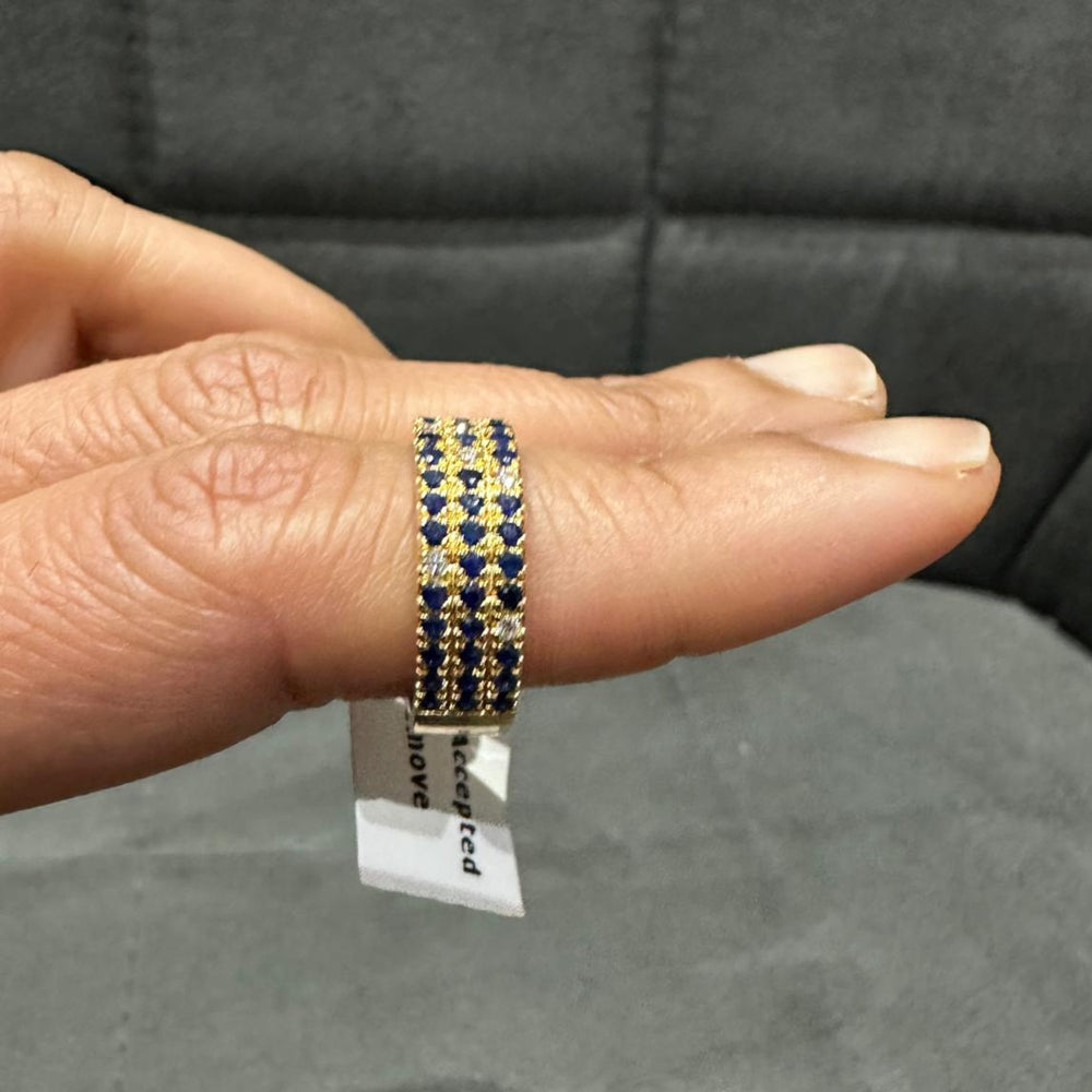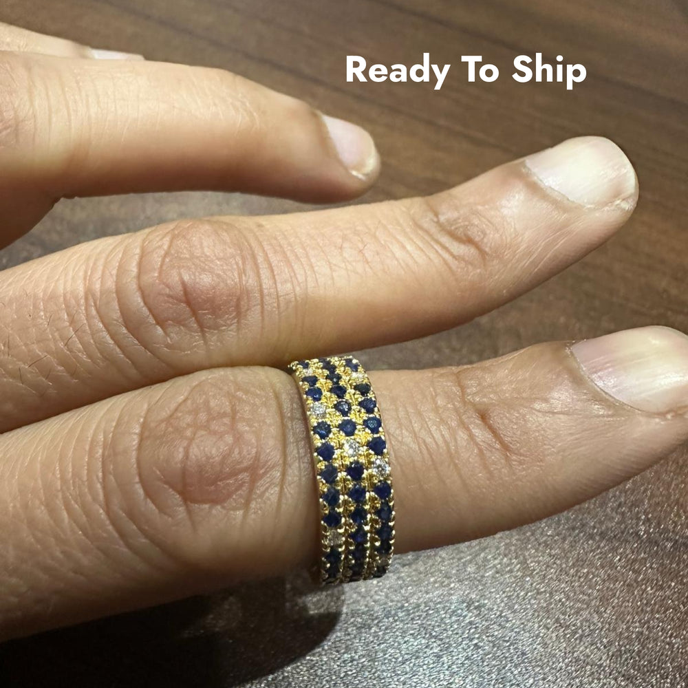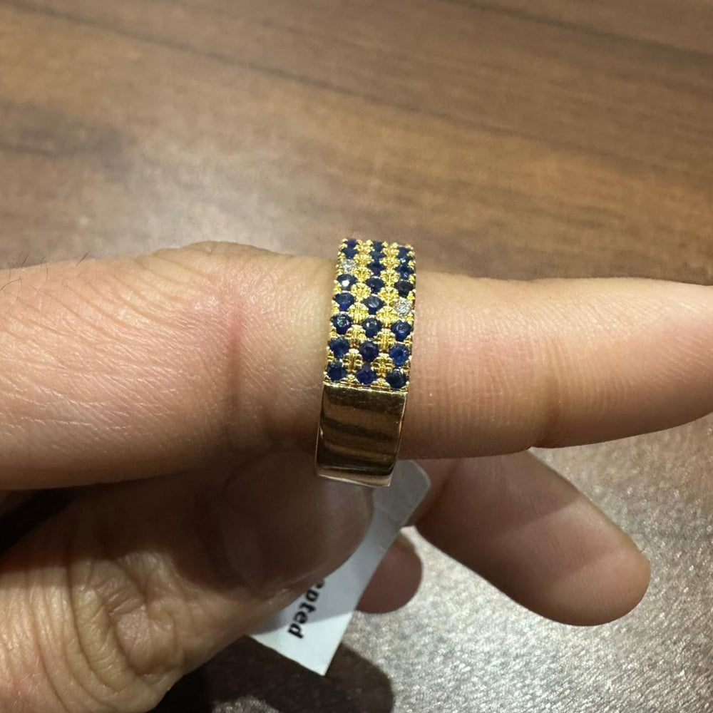 Laissez-vous séduire par l'élégance luxueuse de cette somptueuse bague demi-alliance en or jaune 14 carats , ornée de saphirs bleus et de diamants de laboratoire. Ses rangées alternées de saphirs bleu profond et de diamants de laboratoire d'une brillance exceptionnelle créent un contraste saisissant de couleurs et d'éclat, idéal pour les amatrices de bijoux audacieux et intemporels.