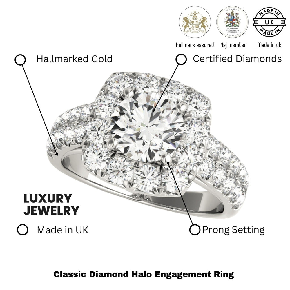 Disponibles en or blanc, jaune ou rose 9K et 18K , ou en platine , avec un poids total de diamants allant de 1,00 ct à 3,00 ct , chaque bague est fabriquée à la main au Royaume-Uni et poinçonnée par le Bureau d'analyse du Royaume-Uni pour garantir sa qualité et son authenticité.