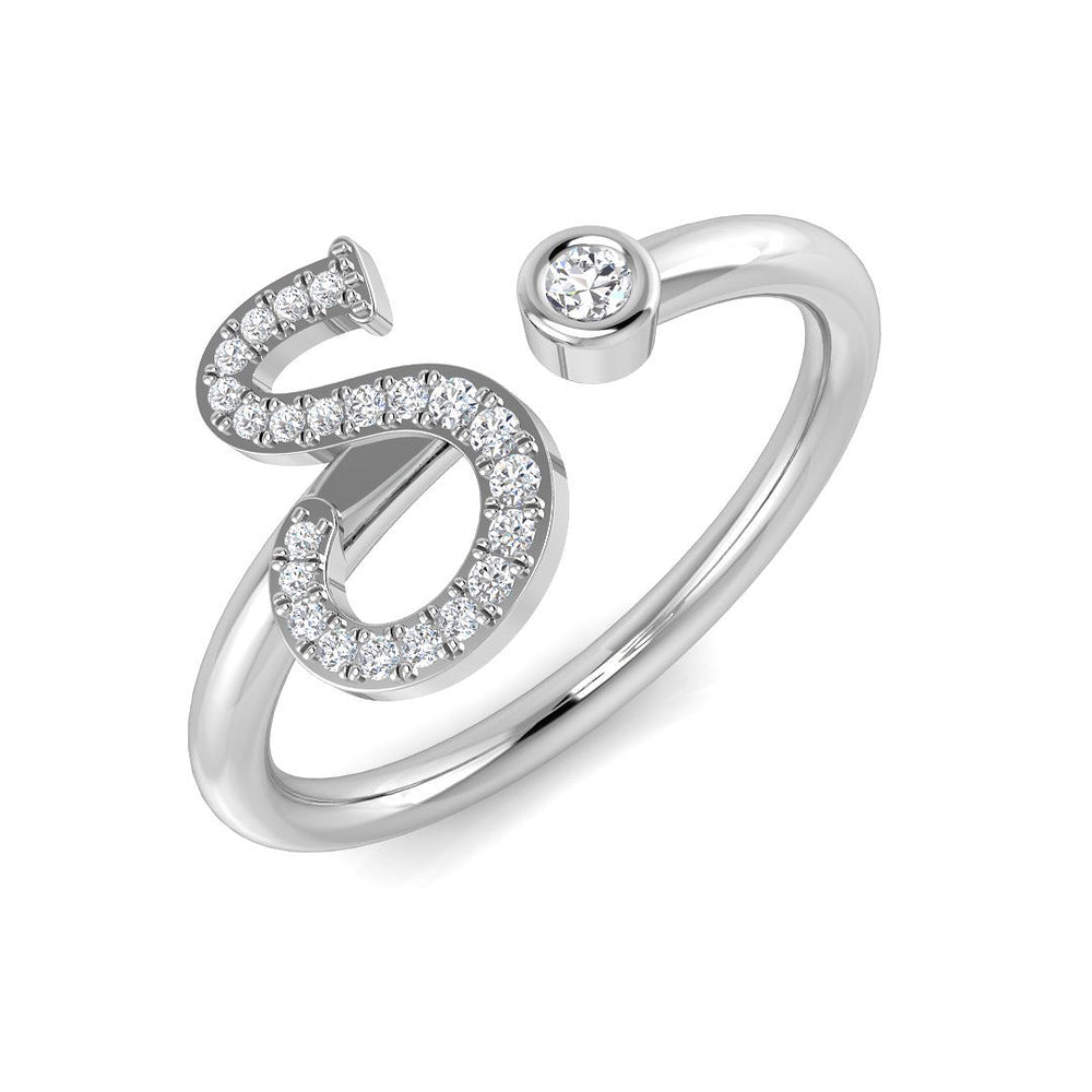 Add a touch of personal elegance with this beautifully designed script S initial ring, featuring 0.10 carat of round brilliant diamonds. The graceful letter “S” sparkles with micro pavé-set diamonds, while a bezel-set solitaire accent adds modern flair. Crafted in your choice of gold or platinum, this ring is the perfect expression of identity and style.