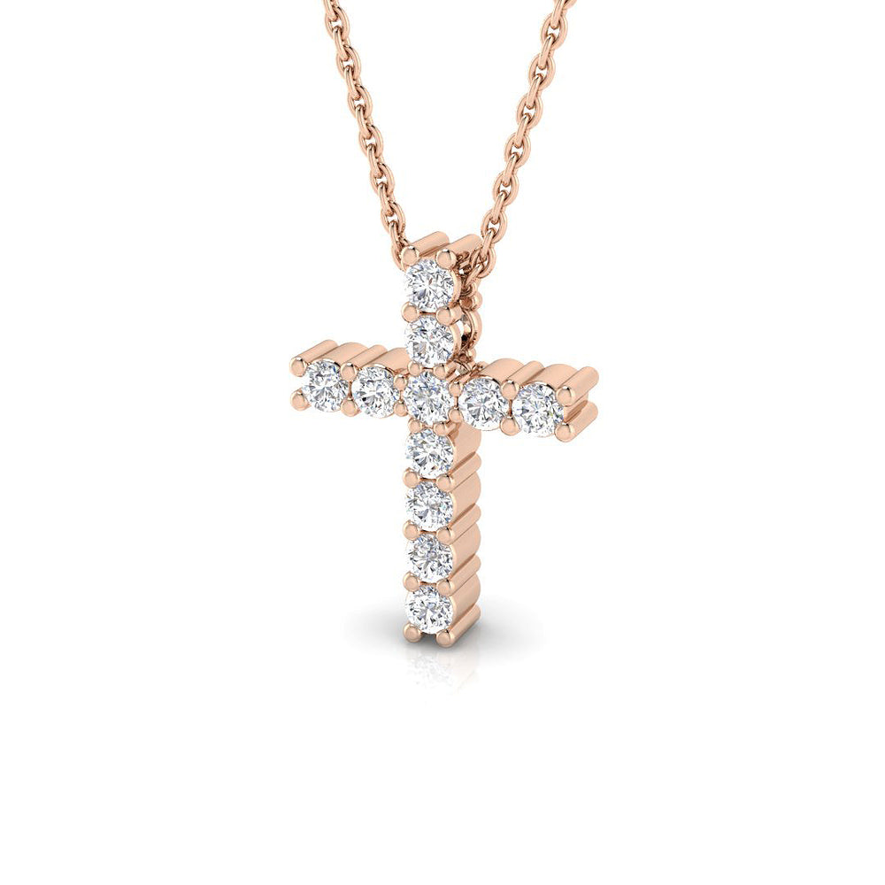 This elegant 0.30ct diamond cross necklace features round brilliant diamonds set in a shared prong setting. The prongs are designed to hold multiple diamonds together, creating a continuous sparkle across the cross pendant. Handcrafted in 9K / 18K gold or platinum, this pendant offers both timeless beauty and modern craftsmanship.