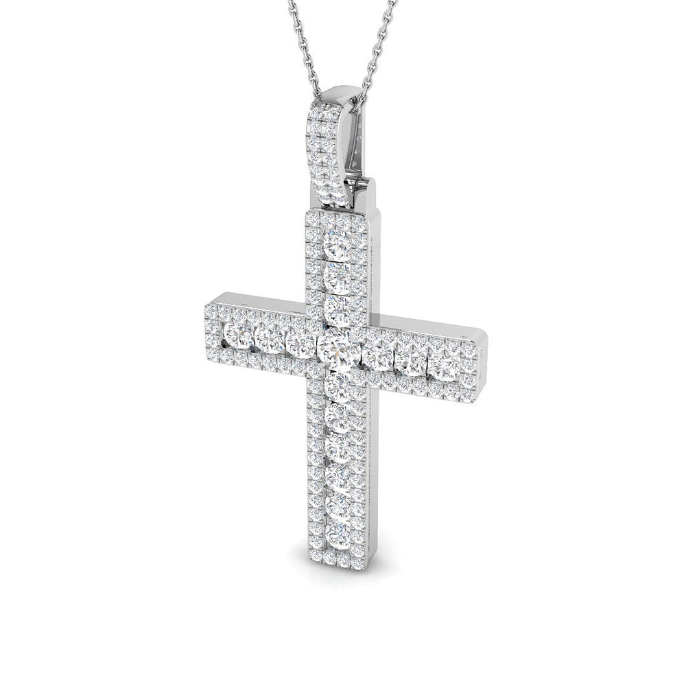 This refined cross pendant features pavé-set round brilliant diamonds, with a central round diamond accent at the intersection of the cross. The simple, clean lines make it an ideal piece for layering or wearing alone for a sparkling touch. Handcrafted in 9K / 18K gold, this pendant radiates elegance and luxury.