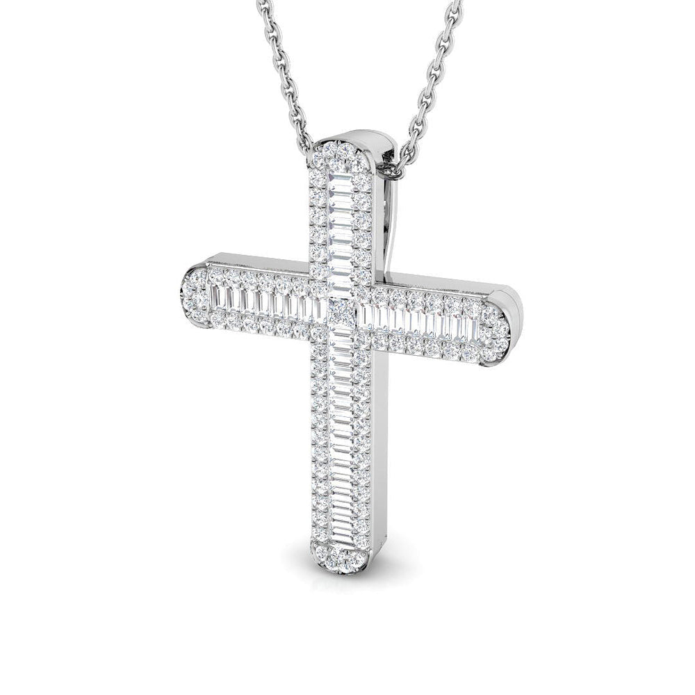 This elegant cross pendant features rows of baguette-cut diamonds along the arms, framed by pavé-set round brilliants for extra sparkle. A single princess-cut diamond sits at the center, adding a unique touch to this refined design. Handcrafted in 9K / 18K gold or platinum, this pendant is perfect for daily wear or meaningful gifting.