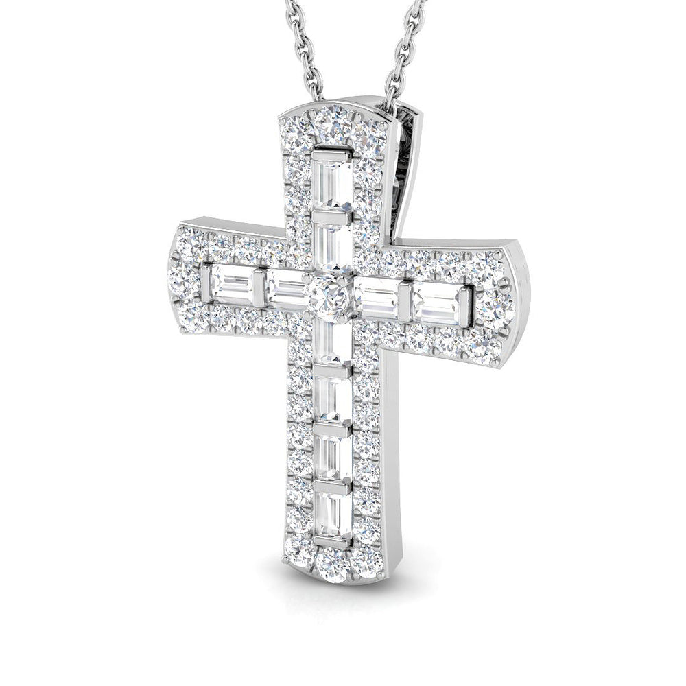 This elegant cross pendant combines the linear brilliance of baguette-cut diamonds with the radiant sparkle of round brilliant diamonds in a pavé halo. A central round diamond anchors the design, while the slightly flared cross silhouette adds a graceful, modern touch. Handcrafted in 9K / 18K gold or platinum, this pendant is ideal for everyday wear or meaningful gifting.
