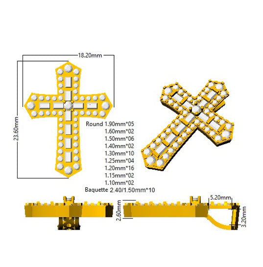 This striking cross pendant is defined by its geometric silhouette and radiant diamond layout. Rows of baguette-cut diamonds form the center cross, while pavé-set round brilliant diamonds add brilliance around the edges. The sharply pointed ends of the cross lend a sleek, modern aesthetic. Handcrafted in 9K / 18K gold, it's a bold yet elegant piece for daily wear or meaningful gifting.