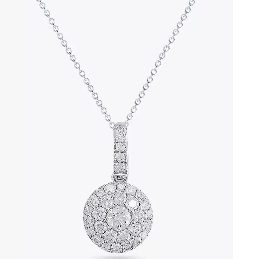 This product is a diamond pendant with a total diamond weight of 1.00 carats. The dimensions are 11mm x 11mm and the main stone shape is round. The metal used is 18K White Gold and the diamond quality is H/Si. The setting is Pave and it comes with a 9K White Gold chain with variable length. The product is UK hallmarked and handcrafted. The diamonds used are conflict-free and nickel-free.