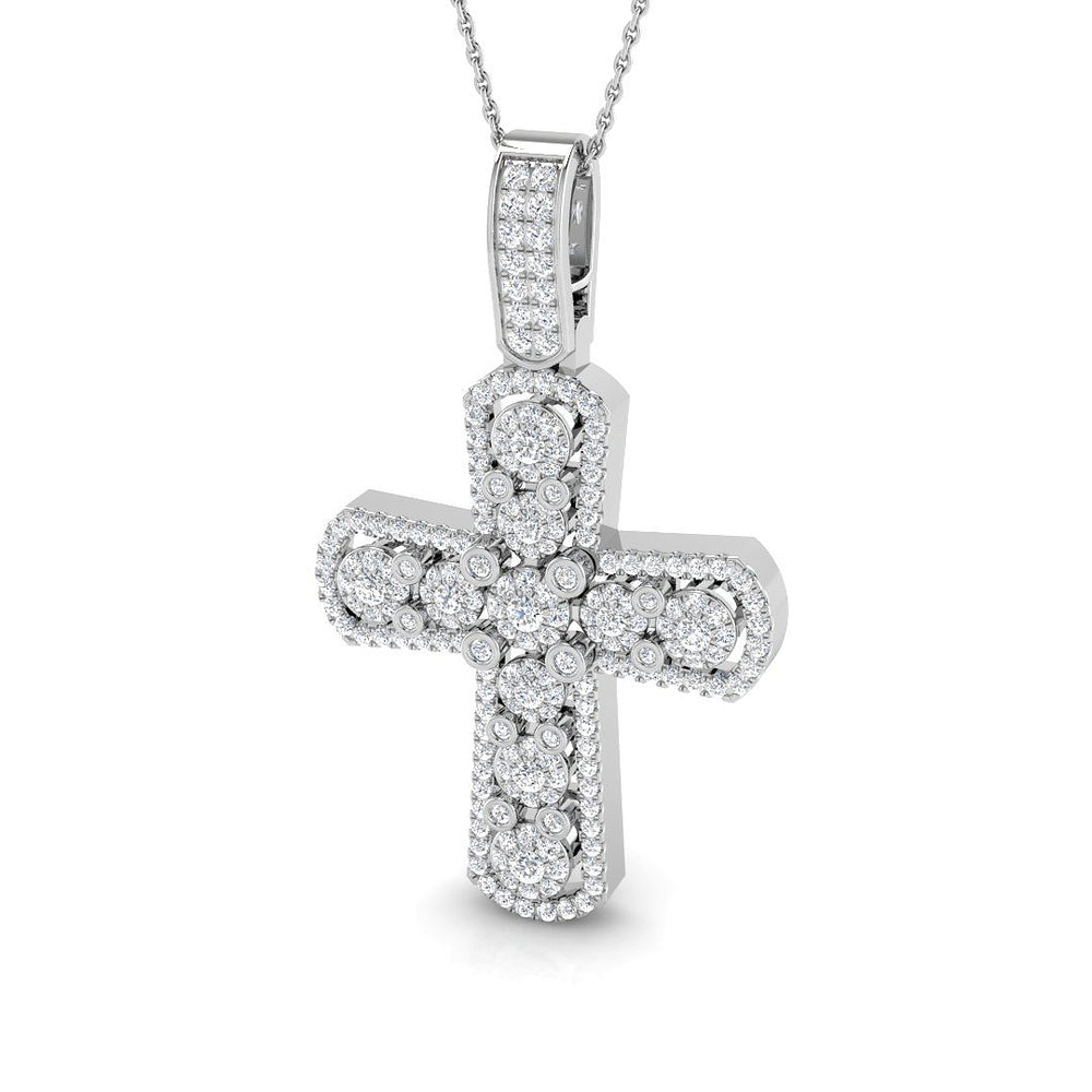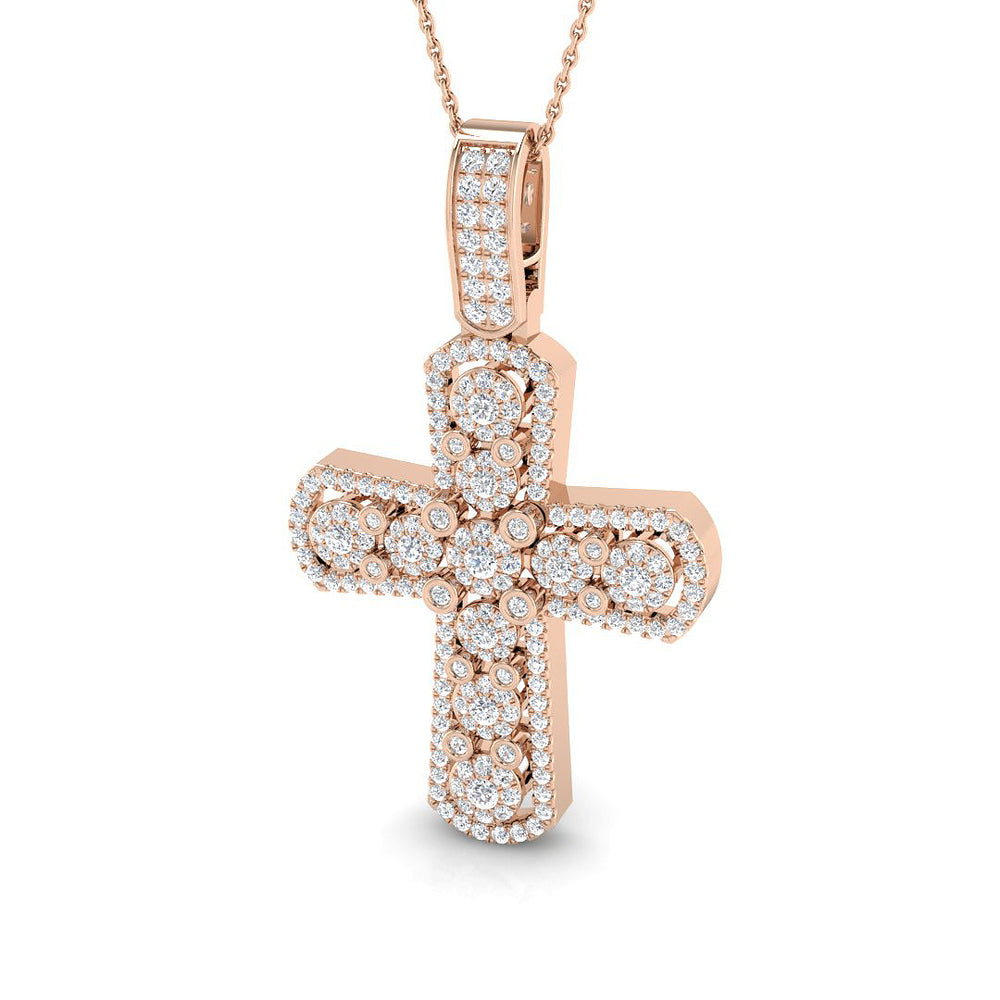 This eye-catching cross pendant is designed with a cluster of round brilliant diamonds, masterfully arranged in a combination of bezel and prong settings. The bold, elevated design creates a dramatic sparkle from every angle, making this a truly standout piece. Handcrafted in 9K / 18K gold or platinum, it’s the perfect expression of faith, strength, and luxury.