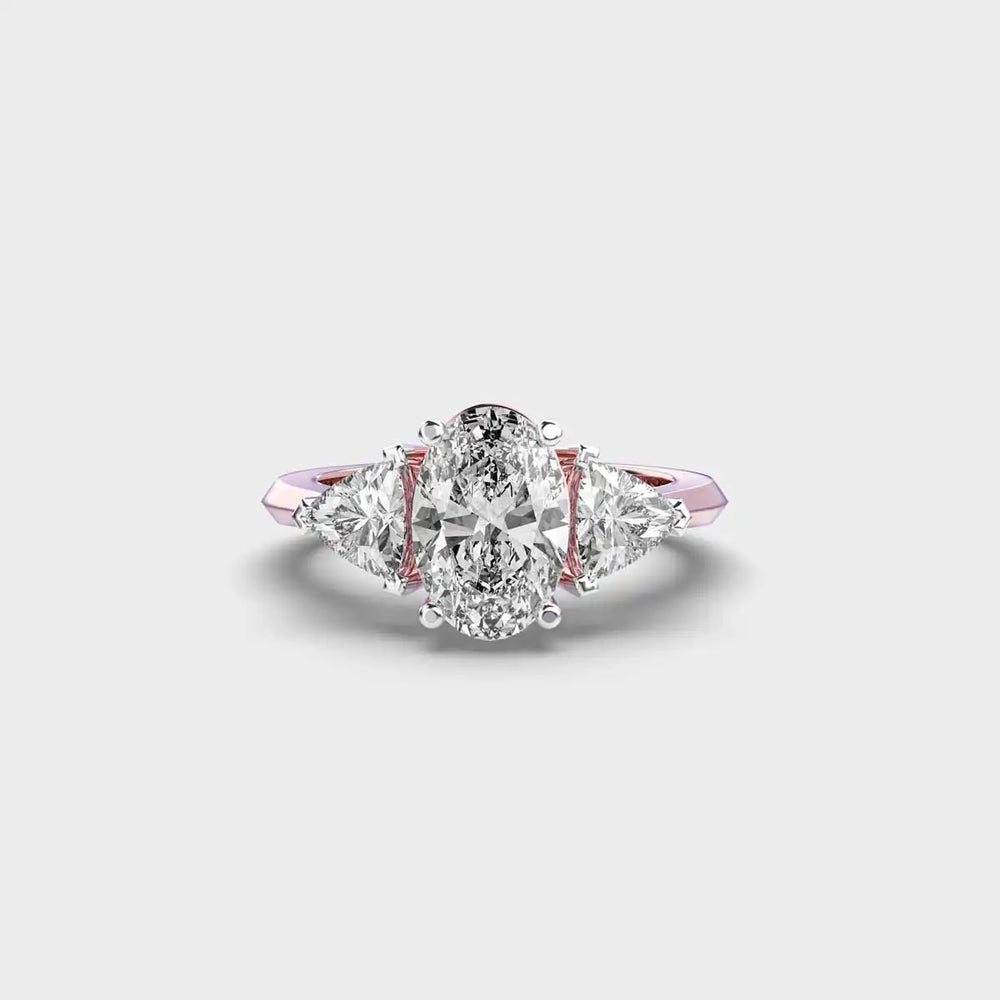 Experience the brilliance and beauty of a 1.50 carat F/VS1 lab grown diamond set in a vintage engagement ring. With its unique oval and trillion shape, this diamond shines perfectly in a claw setting, made with both 18k gold and platinum. A timeless piece that will capture hearts.