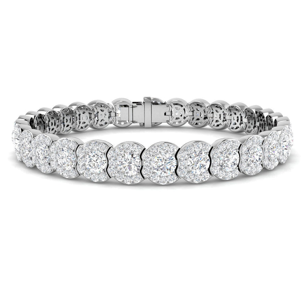 The diamonds are expertly secured in a combination of classic prong and pavé settings, maximizing light return while enhancing the intricate halo detailing. Available in your choice of Natural diamonds (F–G color, VS–SI clarity) or Lab Created diamonds (D–E color, VVS clarity), this bracelet offers exceptional versatility and high-end luxury. Finished with a secure box clasp closure for confident and comfortable wear, this halo diamond tennis bracelet is perfect for weddings, anniversaries, milestone celebrations, or luxury gifting—an exquisite statement of glamour, craftsmanship, and timeless elegance.