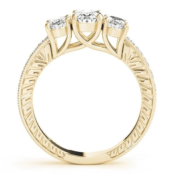 This elegant DE/VS Lab Grown Diamond Engagement Ring is a graceful expression of vintage charm and timeless romance. Featuring an oval-cut center diamond flanked by two matching oval-cut side diamonds, the design is elevated with fine milgrain detailing and subtle Art Deco influences. A true symbol of the past, present, and future — perfect for engagements or anniversaries.