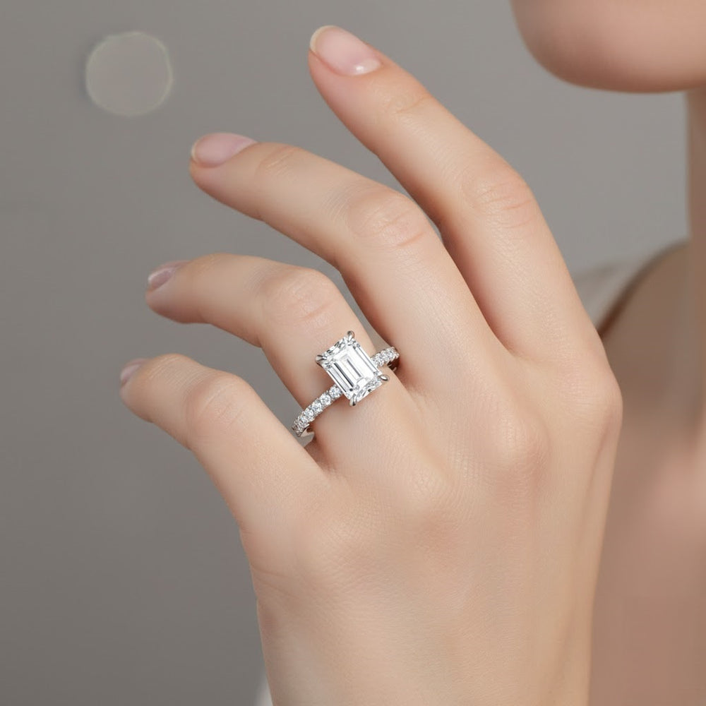 Make your proposal unforgettable with this stunning 18K white gold engagement ring. Featuring a lab-grown emerald cut diamond at its center, the ring is complemented by a band adorned with sparkling round diamonds, bringing timeless elegance to your special moment. Expertly crafted in Hatton Garden, this piece is the perfect symbol of enduring love.