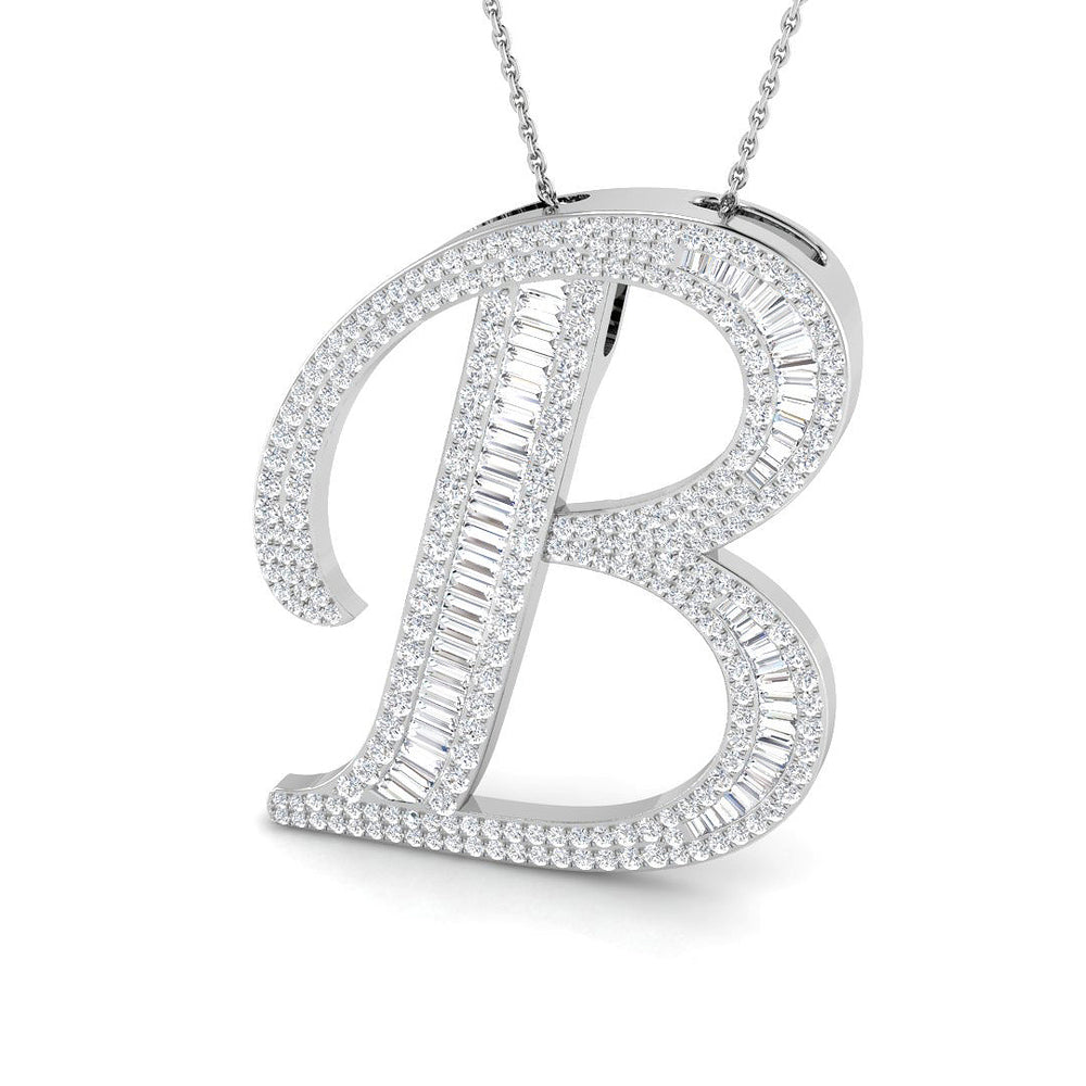 Elevate your jewelry collection with the Gold Diamond Script Initial Pendant, featuring a sophisticated script-style "B" design adorned with a sparkling combination of baguette and round diamonds. This luxurious pendant is perfect for special occasions or for adding a touch of everyday elegance.