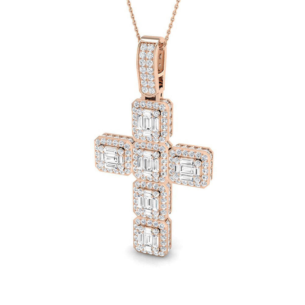 This luxurious cross pendant is composed of baguette-cut and round brilliant diamonds, arranged in a stunning geometric cluster design. Each section of the cross features baguette diamonds at the center, framed by a halo of pavé-set round diamonds. The combination of step-cut clarity and brilliant sparkle creates a sophisticated, eye-catching statement. Handcrafted in your choice of 9K / 18K gold.