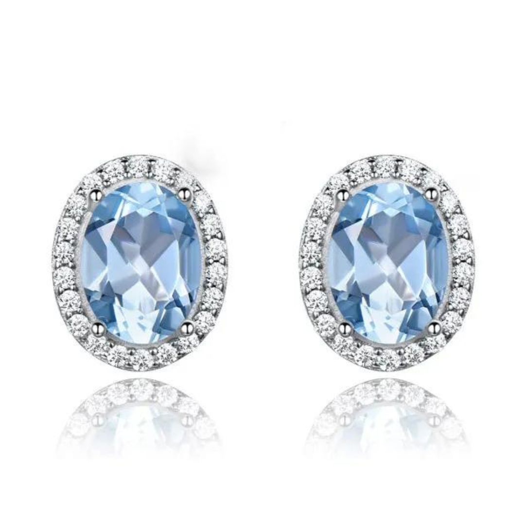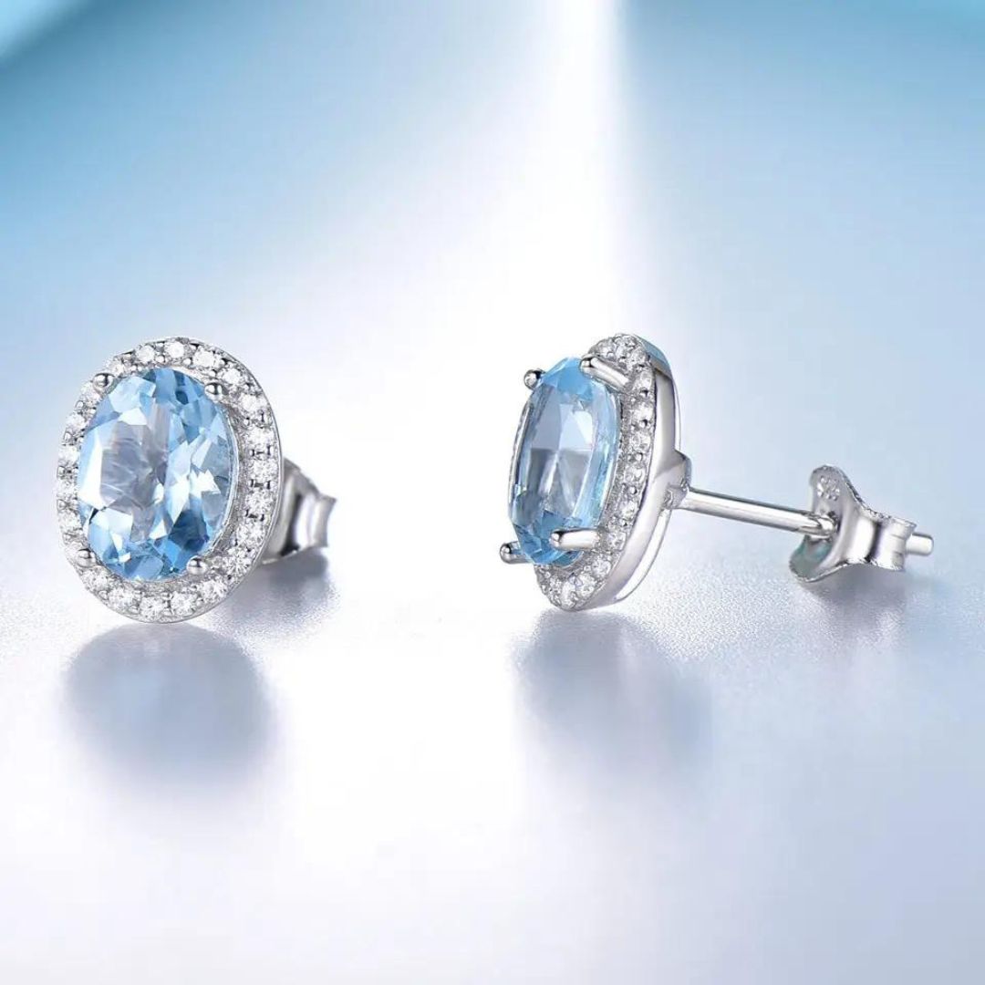 The earrings feature oval cut aquamarine solitaires totaling 3.69 carats, surrounded by high-quality diamonds. The total diamond weight is 0.12 carats. The dimensions of the earrings are 14mm x 11mm. The main stone is aquamarine, set in 9K white gold with a claw setting. The diamonds are of premium quality and conflict-free. The earrings are UK hallmarked, handcrafted, and nickel-free. It's mentioned that weights, gem colors, and sizes are approximate and may vary slightly.