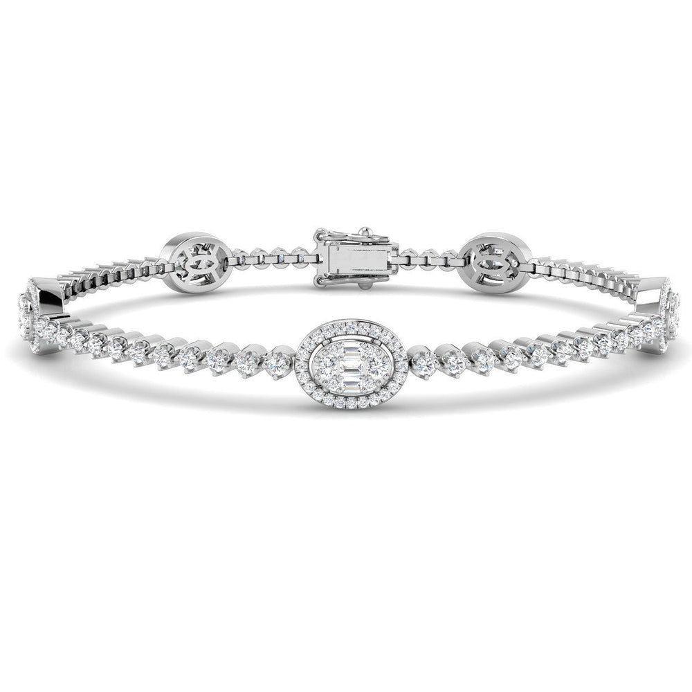 Add a touch of luxury to your collection with this exquisite diamond bracelet, beautifully designed with a refined single-line round brilliant chain crafted in a classic prong setting. The bracelet features a striking oval-style solitaire motif, elegantly adorned with a mix of round brilliant and baguette-cut diamonds set in a sophisticated pavé design, creating depth, brilliance, and a modern, refined appeal.