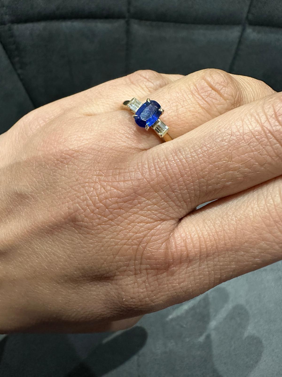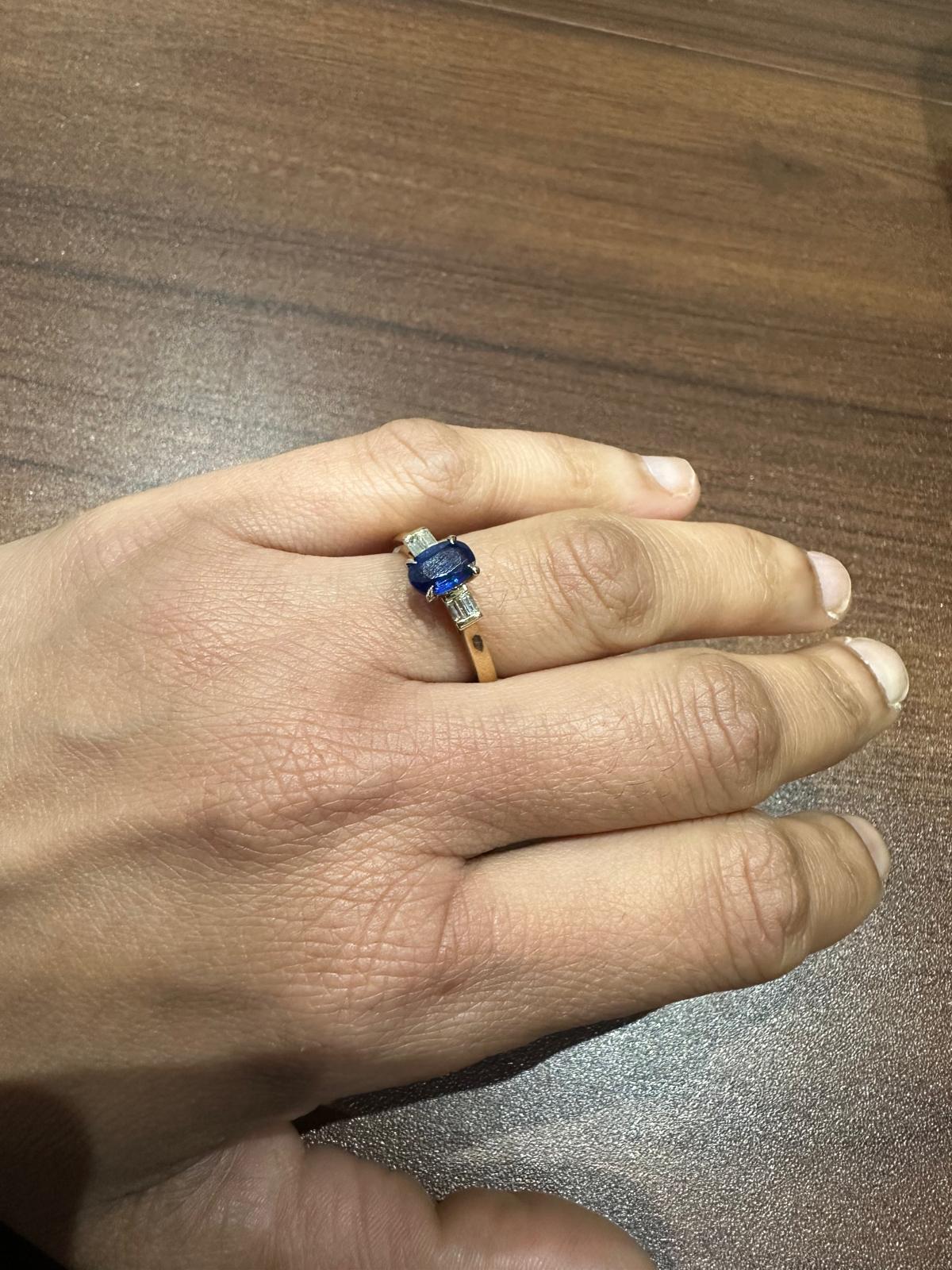 9K Yellow Gold Prong Set Three Stone Natural Saphire Oval Diamond Ring