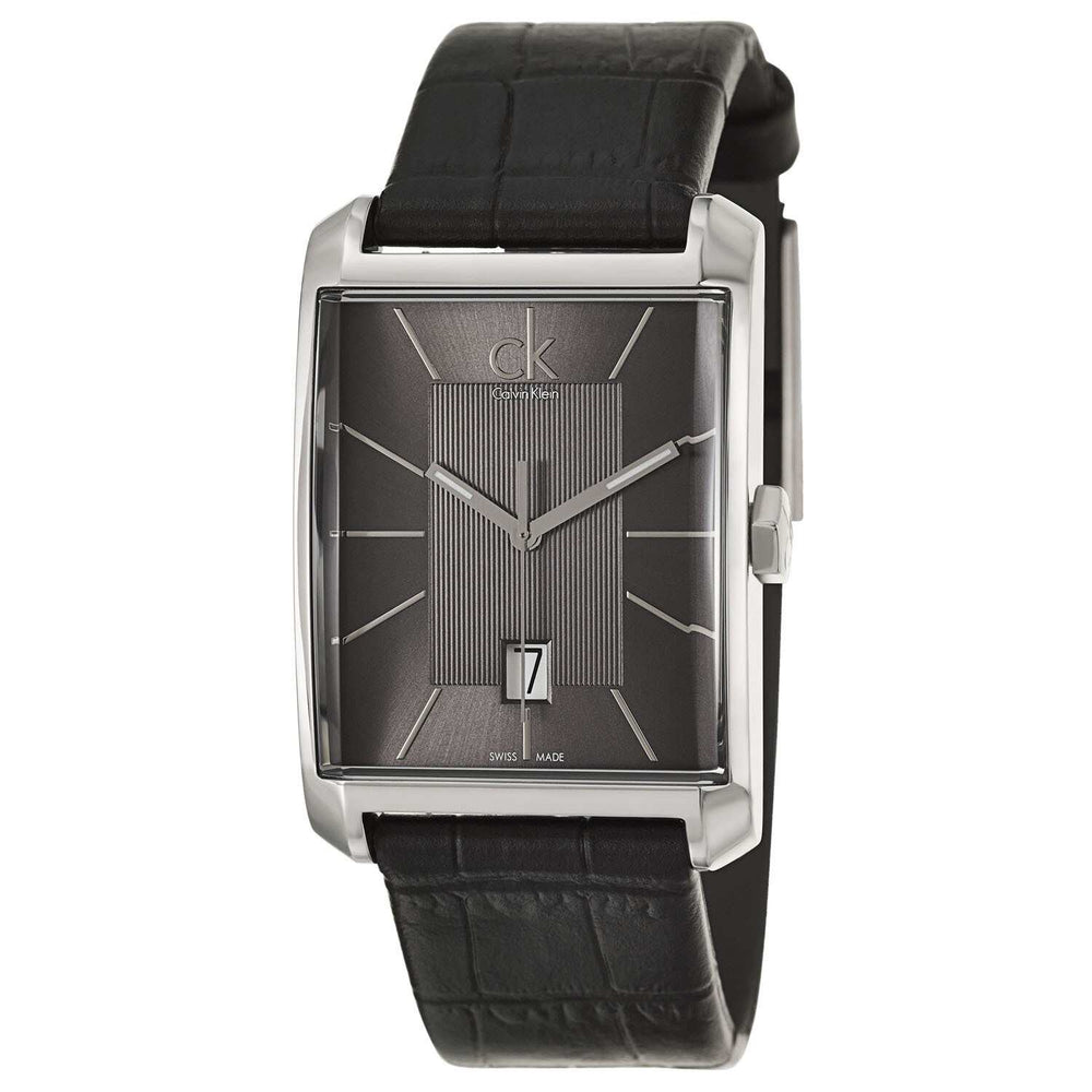 A rectangular bezel is filled with a textured grey dial and silvertone markers with luminescent hands in this Window watch. Held together with an embossed black leather strap, this reliable Swiss-quartz timepiece is designed by Calvin Klein.