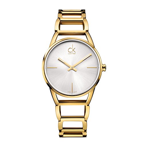 This attractive ladies Calvin Klein Stately watch has a PVD gold plated case and is fitted with an analogue quartz movement. It is fastened with a gold tone metal bracelet and has a silver dial.