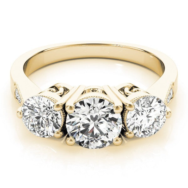 This DE/VS Lab Grown Round Diamond 3-Stone Engagement Ring is set in a designer milgrain art deco band, available in 9K, 18K White, Yellow, Rose Gold, and Platinum. The trilogy design features 3 stunning round diamonds, with a total weight ranging from 0.50Ct to 2.00Ct, representing the past, present, and future of your love. The art deco band is meticulously crafted with milgrain detailing, adding a vintage-inspired touch to the timeless trilogy setting.