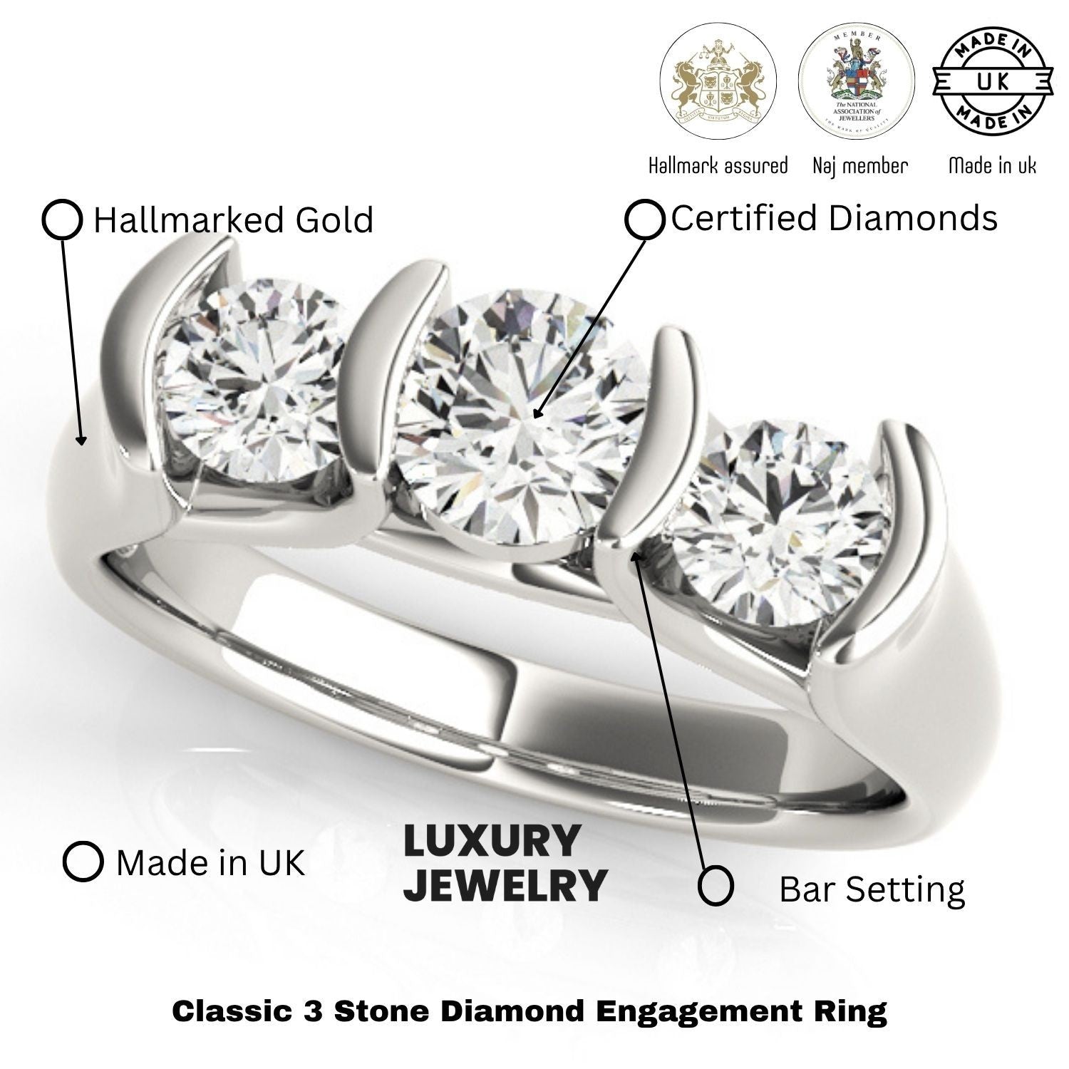 💎 DE/VS Lab Grown Round Diamond 3-Stone Engagement Ring 9K, 18K, Platinum 0.50Ct to 2.00Ct"