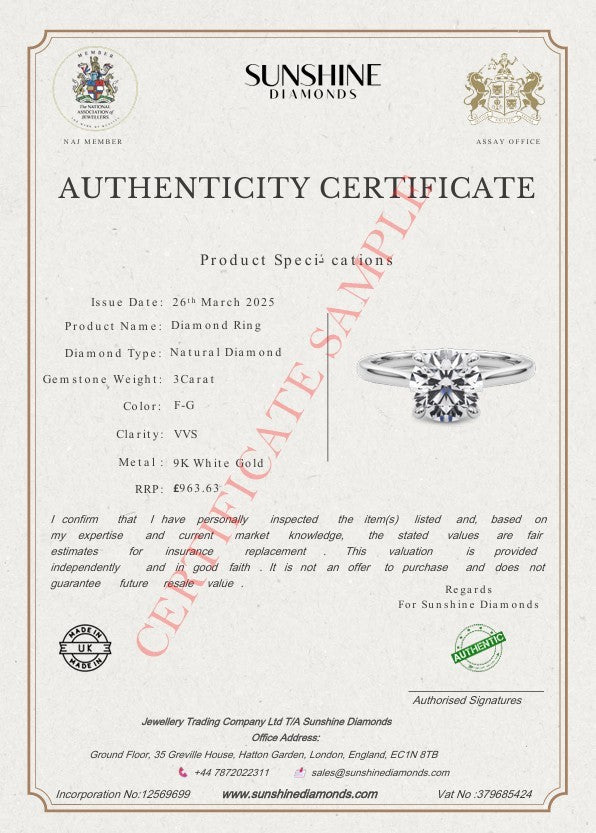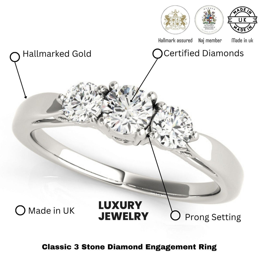 The trilogy design is timeless and elegant, while the choice of 9K, 18K white, yellow, or rose gold, or platinum ensures this ring is as unique as your love story. It’s hallmarked by the UK Assay Office, ensuring authenticity and superior craftsmanship.