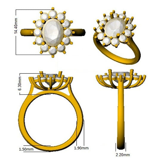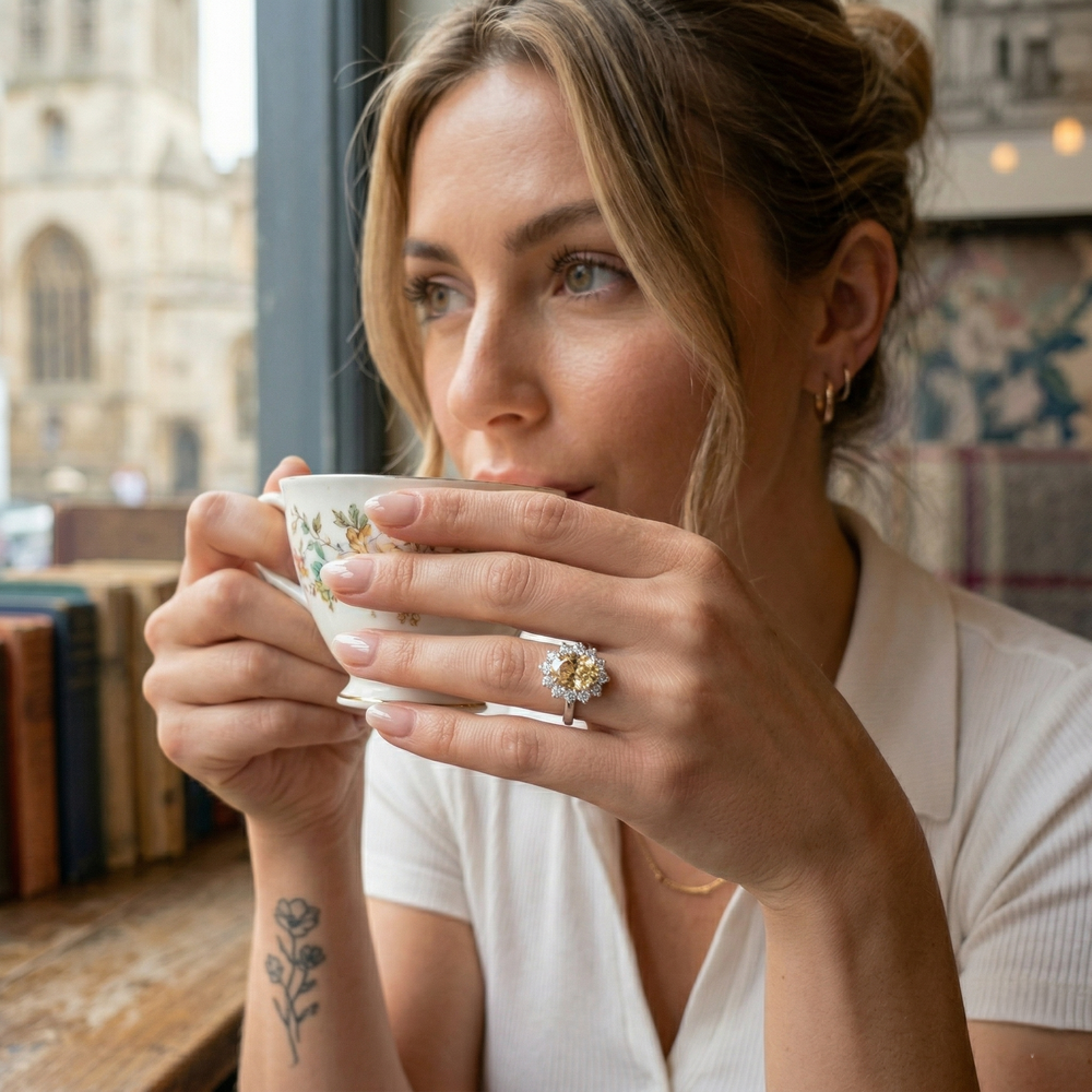 Surrounded by a floral halo of brilliant round diamonds, this ring creates a beautiful flower-inspired cluster that enhances the centre stone’s colour and brilliance. The elegant band and detailed setting make this piece perfect for engagements, anniversaries, or a standout fashion statement.