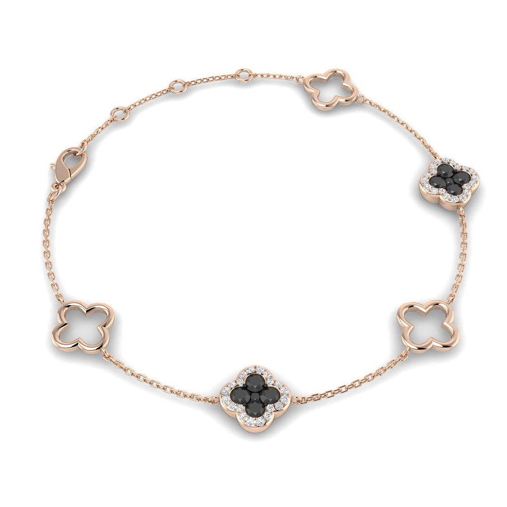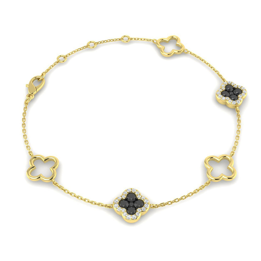 Add a refined touch of everyday luxury to your collection with this elegant clover diamond chain bracelet, thoughtfully designed to balance timeless beauty with a modern, expressive edge. The bracelet features a graceful arrangement of three polished solid gold clover motifs along the chain, beautifully accented by two clover motifs set with round black and white diamonds in pavé settings. This striking contrast creates a refined, feminine silhouette with distinctive sparkle and contemporary elegance.