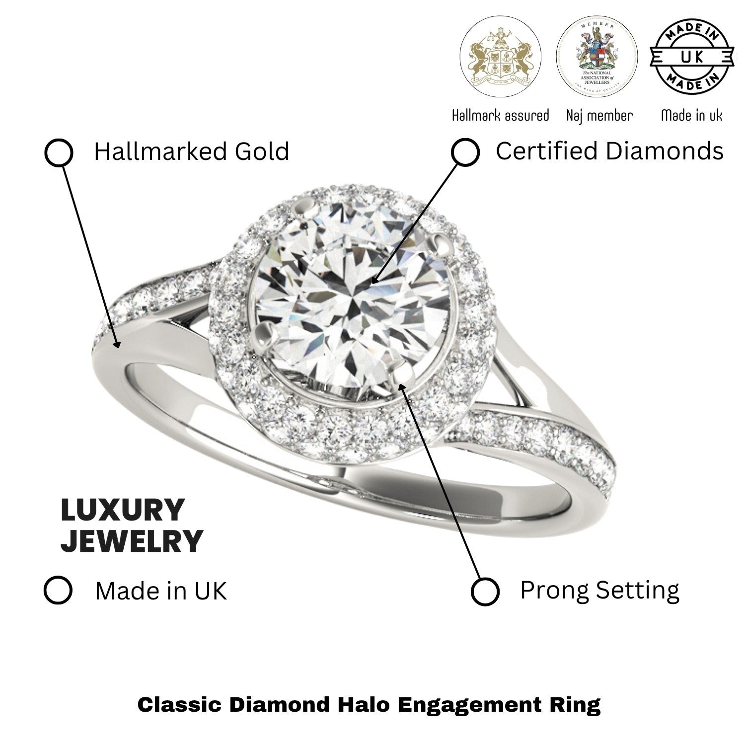 Available in 9K, 18K White, Yellow, Rose Gold, or Platinum, with total diamond weights ranging from 0.50Ct to 2.00Ct, each ring is handcrafted in the UK and hallmarked by the UK Assay Office for guaranteed quality and authenticity.