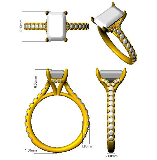 This elegant emerald cut diamond engagement ring features a beautifully proportioned emerald-cut centre stone, celebrated for its clean lines, hall-of-mirrors brilliance, and timeless sophistication. The centre diamond is secured in a refined prong setting, allowing light to enhance its clarity and step-cut sparkle.