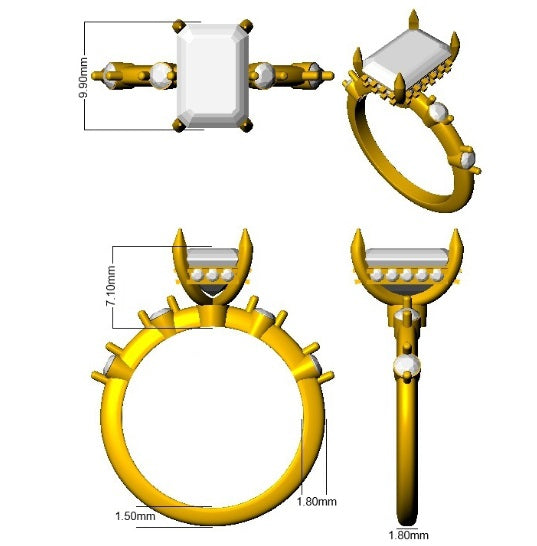 This sophisticated emerald cut diamond engagement ring is designed to highlight elegance through clean geometry and refined detailing. The elongated emerald cut centre diamond is securely held in a classic prong setting, showcasing its step-cut facets and exceptional clarity.