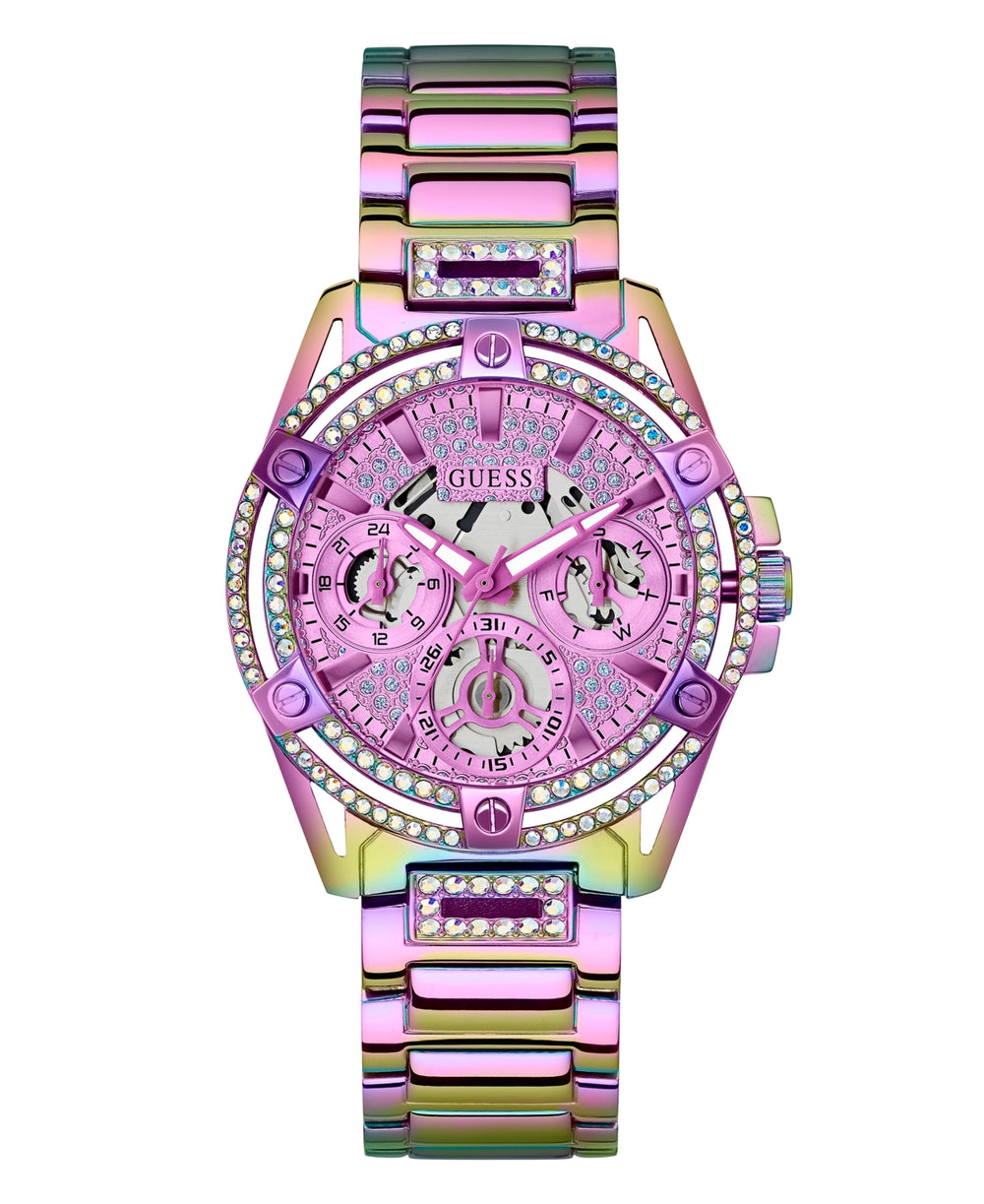 Shine in every light with the Guess Women's Iridescent Multi-Function Watch GW0464L4, a vibrant and fashion-forward timepiece designed to turn heads. Featuring a stunning iridescent stainless steel case and bracelet, this watch shifts in color beautifully depending on the angle, creating a unique and luxurious appeal.