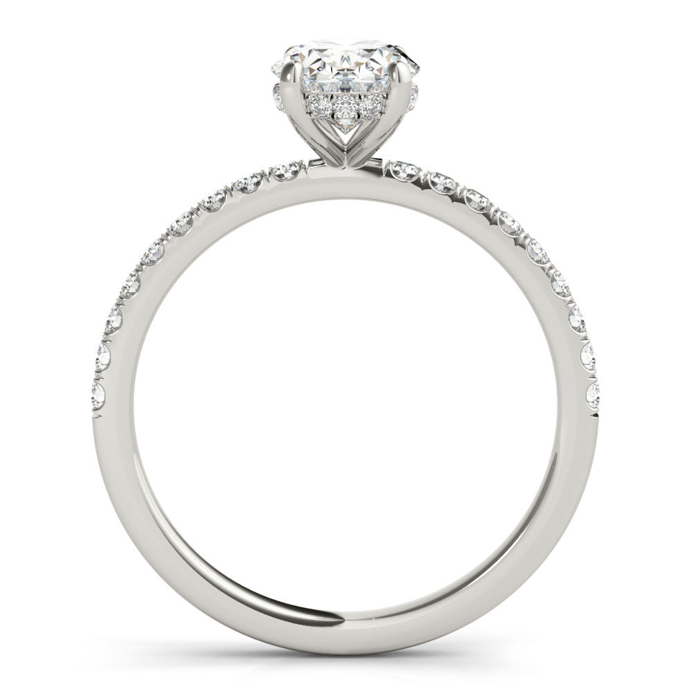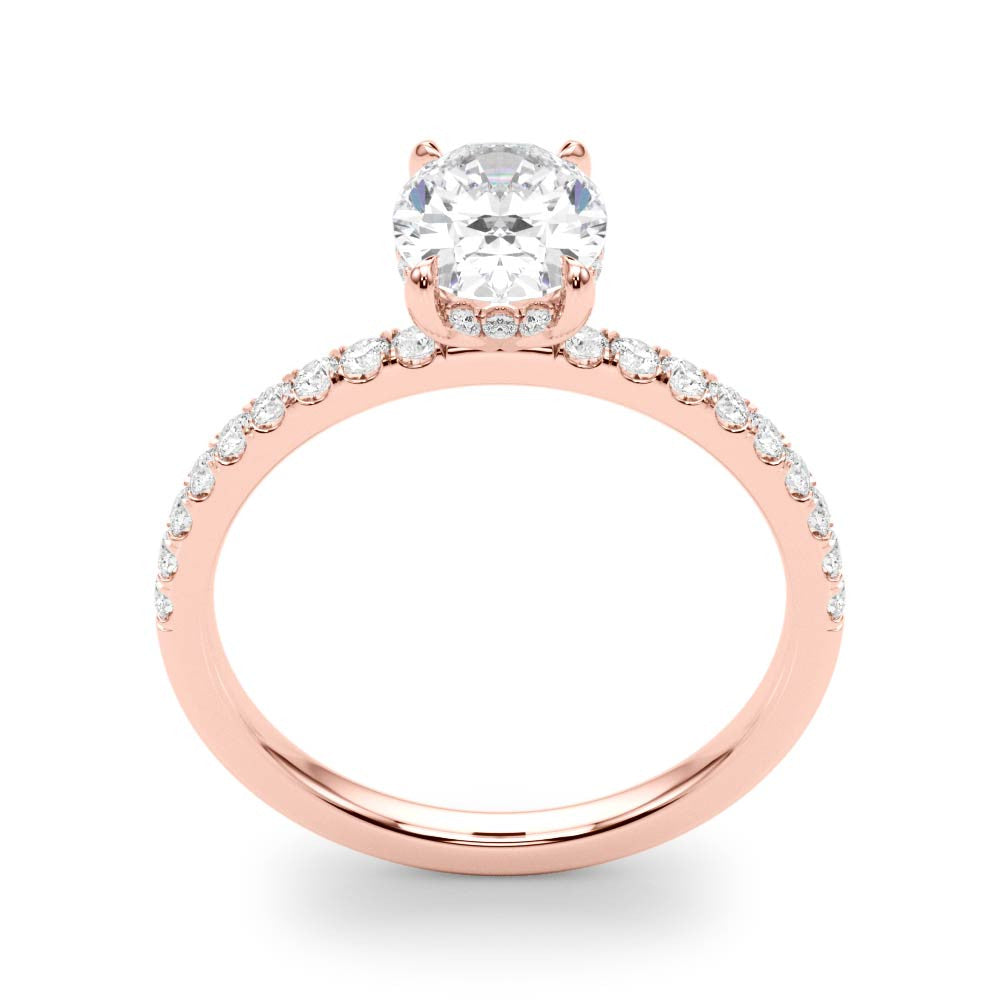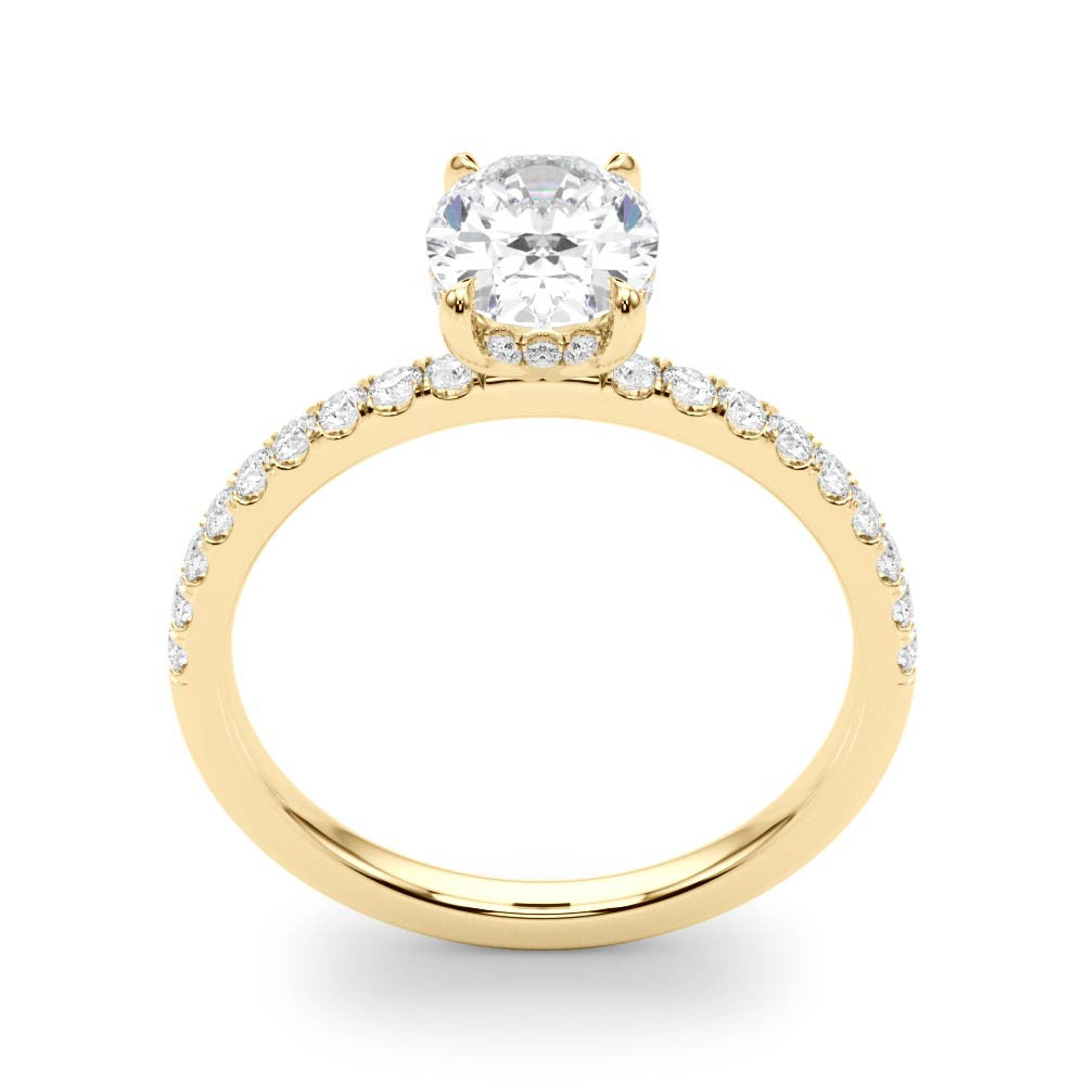 This stunning engagement ring boasts a 1.00 carat oval lab-created diamond set in 18k yellow gold. The hidden halo design adds a touch of elegance and uniqueness. Perfect for the modern and eco-conscious couple who still want the beauty and luxury of a diamond.