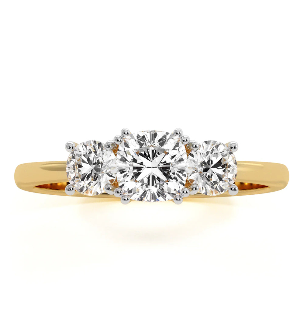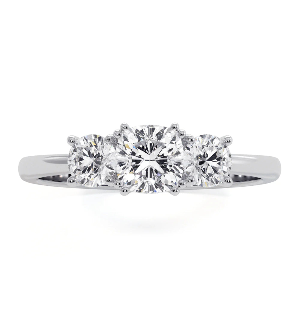 Experience the beauty and brilliance of our Lab Grown Cushion Diamond 3 Stone Engagement Ring. With multiple carat options and a stunning cushion shape, this ring is sure to make a statement. Set in a claw setting with F/VS1 lab grown diamonds, crafted in 18k gold and platinum. A perfect symbol of everlasting love.