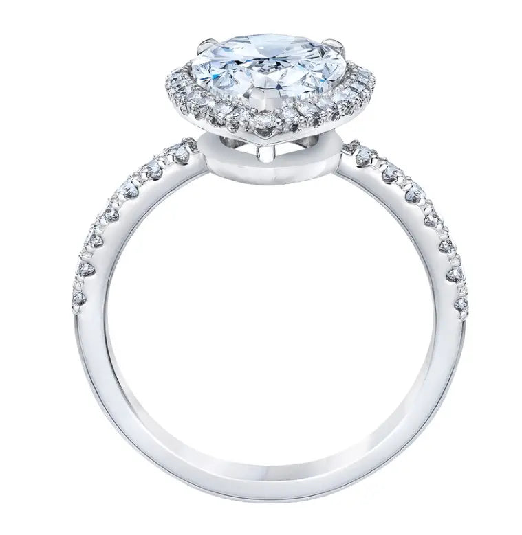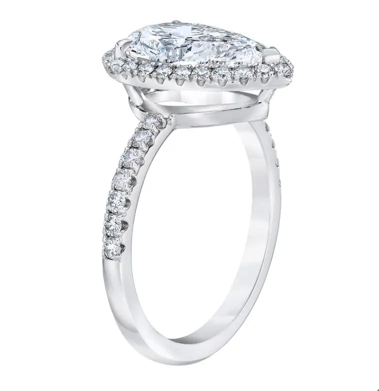 This stunning Lab Grown Pear Diamond Halo Engagement Ring combines multiple carats of lab grown diamonds with a striking pear shape, framed by a sparkling halo and set in a luxurious 18k gold or platinum band. Make a statement with this ethically sourced and dazzling ring.