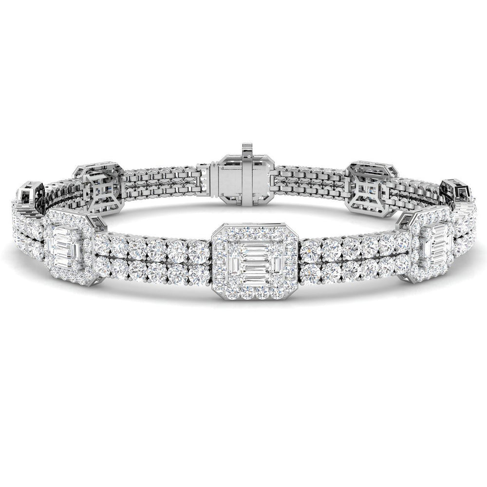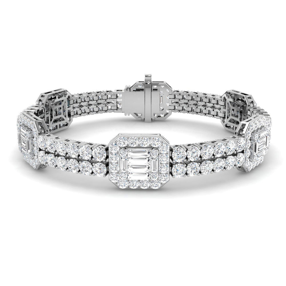 Add a refined touch of luxury to your collection with this exquisite emerald-style diamond tennis bracelet studded with baguette and brilliant diamonds, where classic elegance meets modern sophistication. The bracelet features double row of round-cut diamond chain links, each beautifully set to create a smooth, continuous flow of brilliance. This refined double-link design enhances sparkle from every angle while maintaining a clean, contemporary silhouette with timeless appeal.