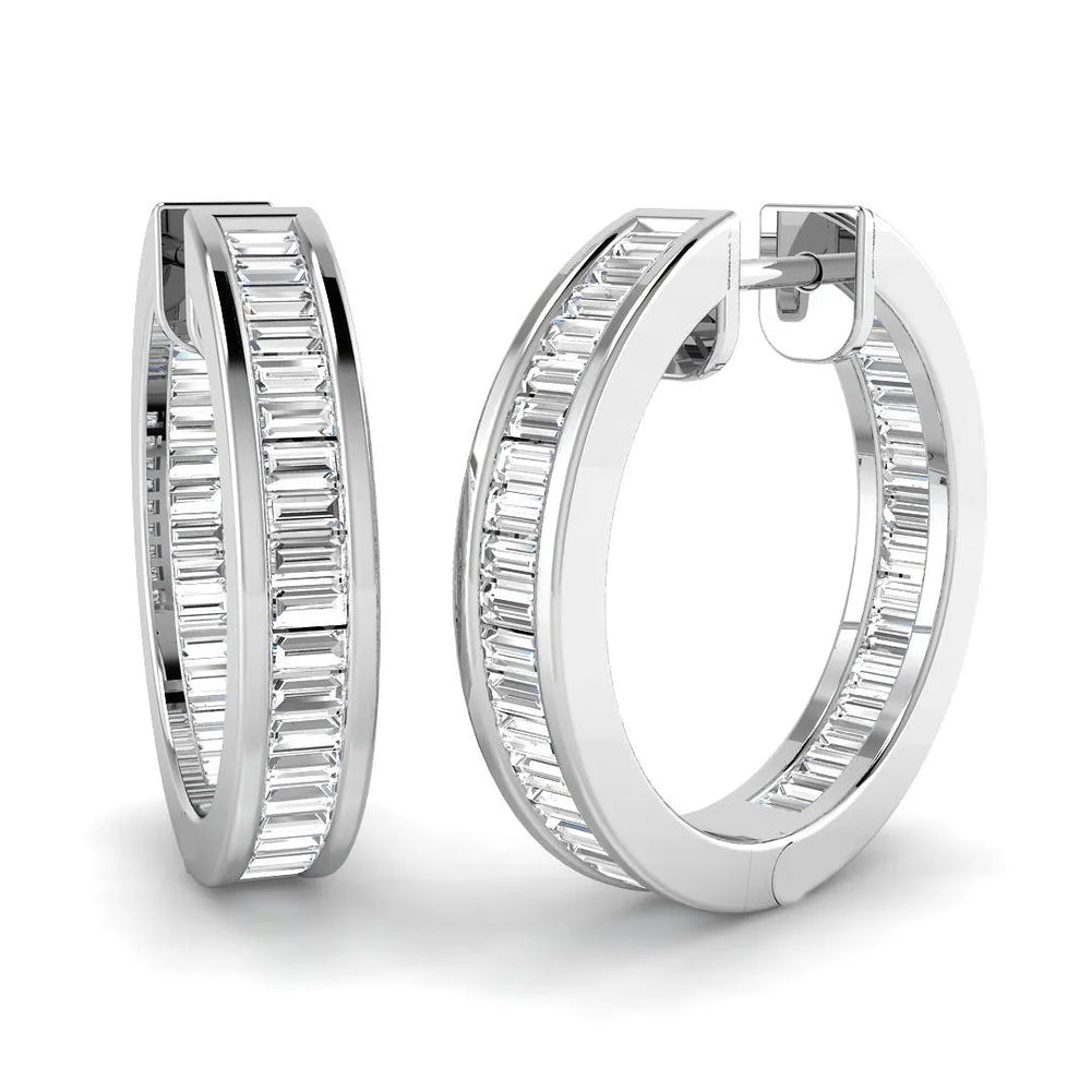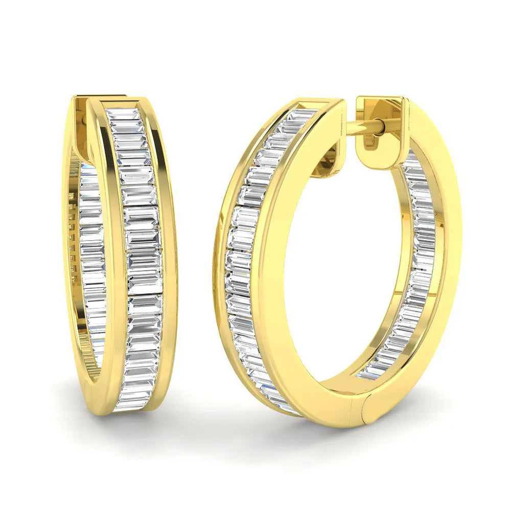 Add elegance and sparkle to your collection with these stunning Hoop Earrings featuring Natural (F/VS-SI) and Lab-Grown (D/VVS) Baguette Cut Diamonds. Available in 9K or 18K White, Yellow, Rose Gold, or Platinum, each earring is expertly handcrafted and bezel-set for maximum brilliance and security.