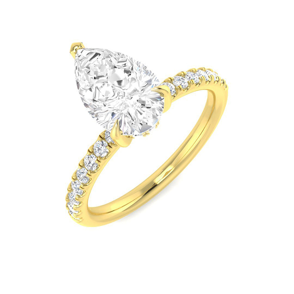 Make a timeless statement with this elegant pear cut diamond engagement ring, designed to capture light from every angle. The stunning pear-shaped centre diamond is securely set in a refined claw setting, enhanced by a pavé-set band that adds extra brilliance and sophistication.