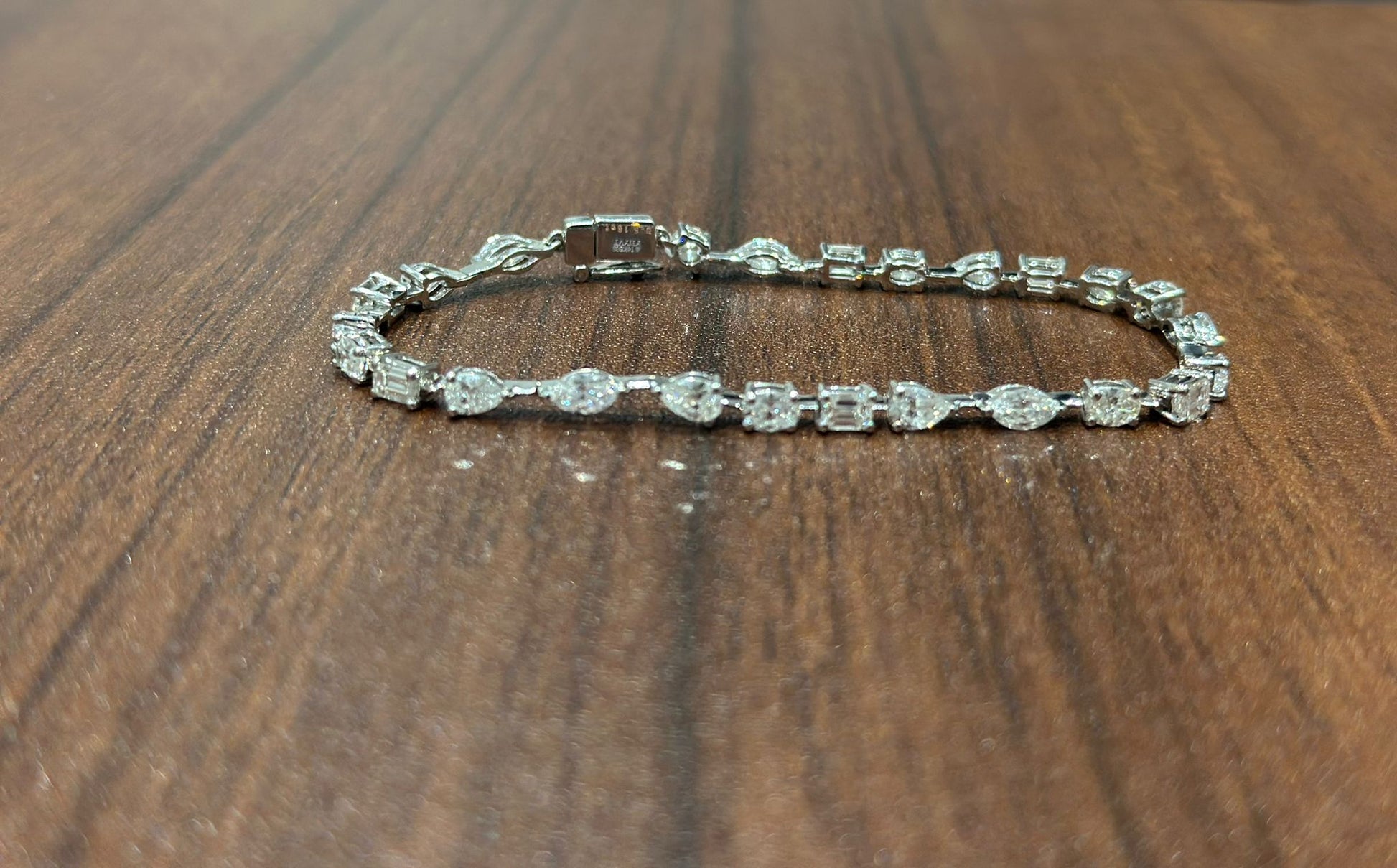 The unique mix of diamond silhouettes creates a fluid, eye-catching pattern that sparkles from every angle. With diamonds graded GH color and VS–SI clarity, the bracelet offers bright, near-colorless beauty with excellent clarity and sparkle, making it perfect for weddings, anniversaries, or high-end fine jewelry gifting.