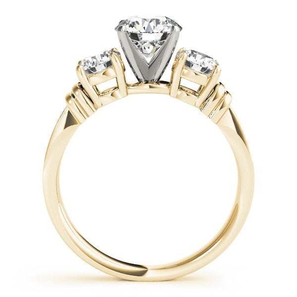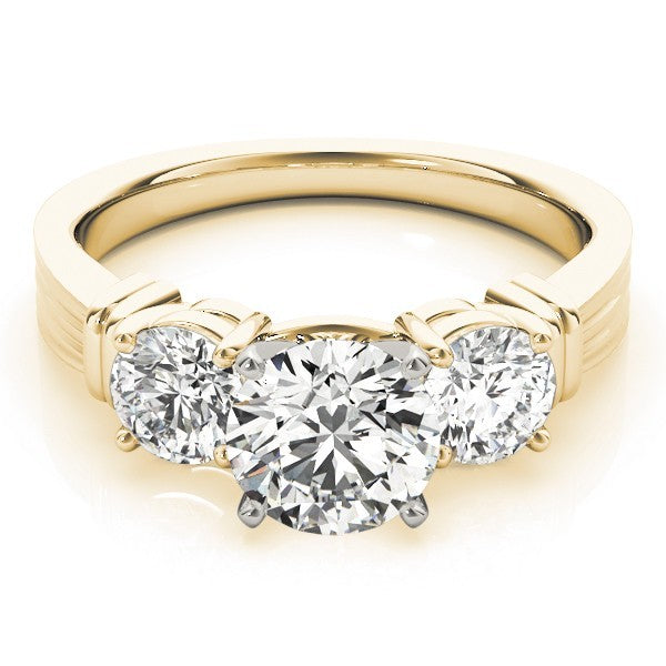 This beautiful 0.50Ct to 2.00Ct lab-grown round diamond trilogy engagement ring features three brilliant round diamonds, symbolizing the past, present, and future. The diamonds are prong set, offering maximum brilliance and ensuring the stones are securely placed.
