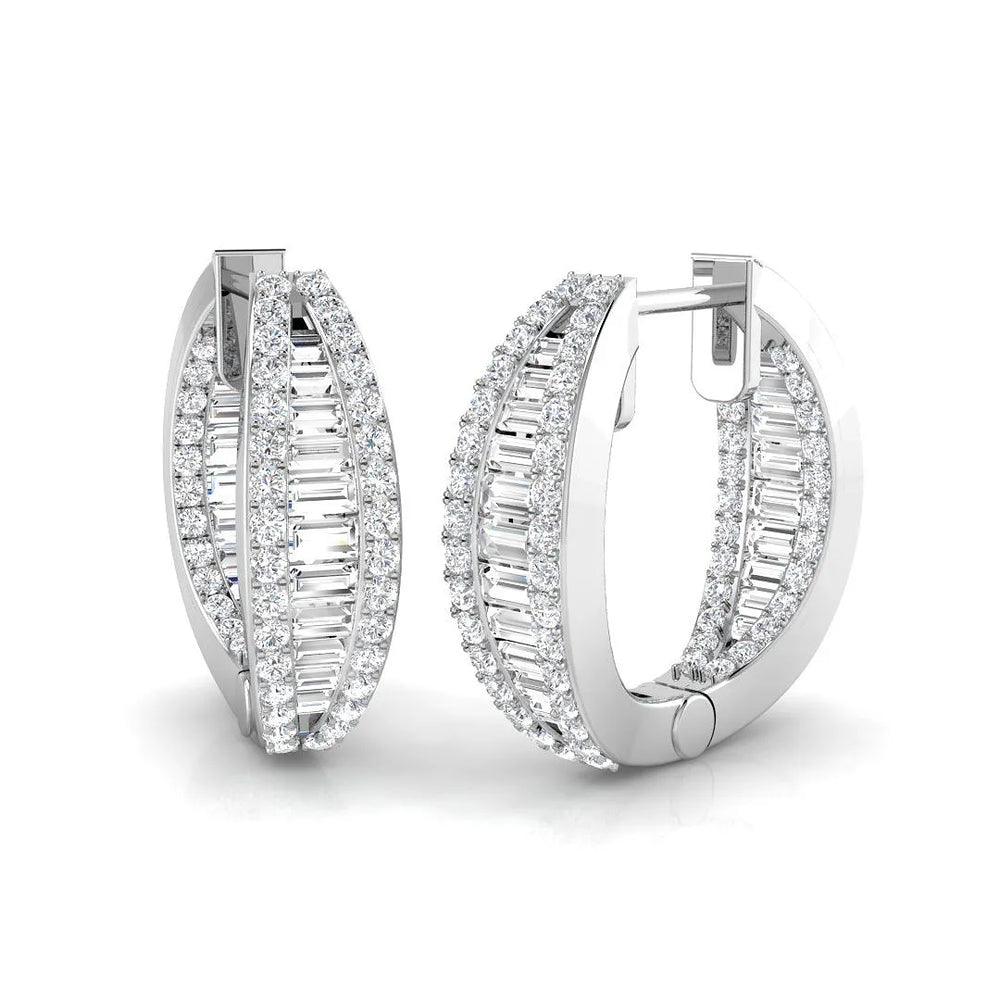 Add elegance and sparkle to your collection with these stunning Hoop Earrings featuring Natural and Lab-Grown Round Cut Diamonds. Crafted with 1.25Ct total diamond weight, these earrings feature 44 Baguette Bezel Set Diamonds (0.66Ct) and 112 Round Pavé Set Diamonds (0.55Ct). Available in your choice of 9K or 18K White, Yellow, Rose Gold, or Platinum, each earring is expertly handcrafted for brilliance and sophistication.
