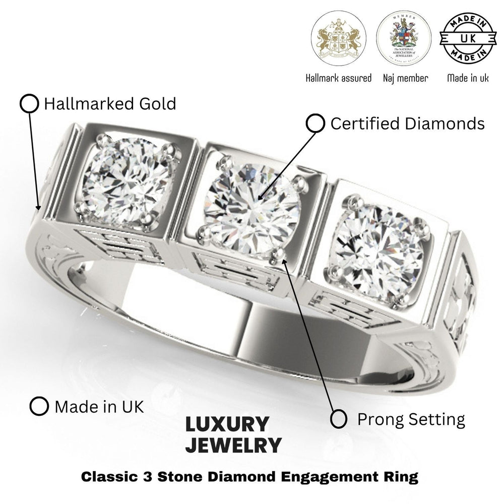 This 3-stone engagement ring is perfect for engagements, special occasions, or as a timeless gift. It’s hallmarked by the UK Assay Office, ensuring authenticity and superior craftsmanship.